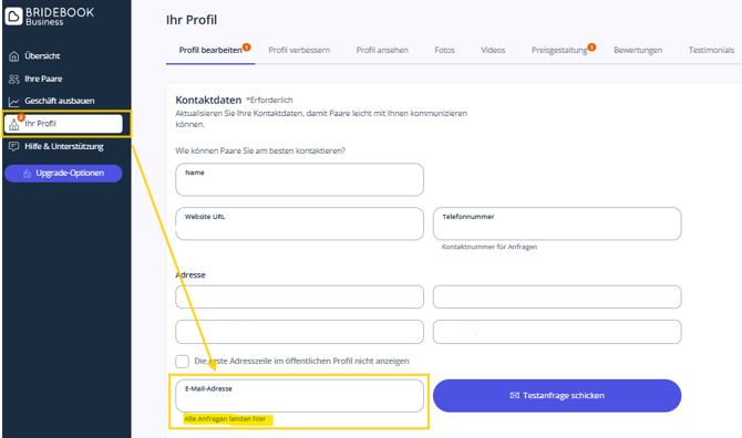 Falls du dir nicht sicher bist, welche E-Mail du für Anfragen hinterlegt hast, logge dich einfach in dein Bridebook Business-Profil ein, um es herauszufinden.