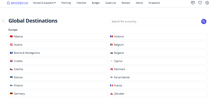 Or simply go to: Global Destinations to find out if Bridebook is available in your preferred country.