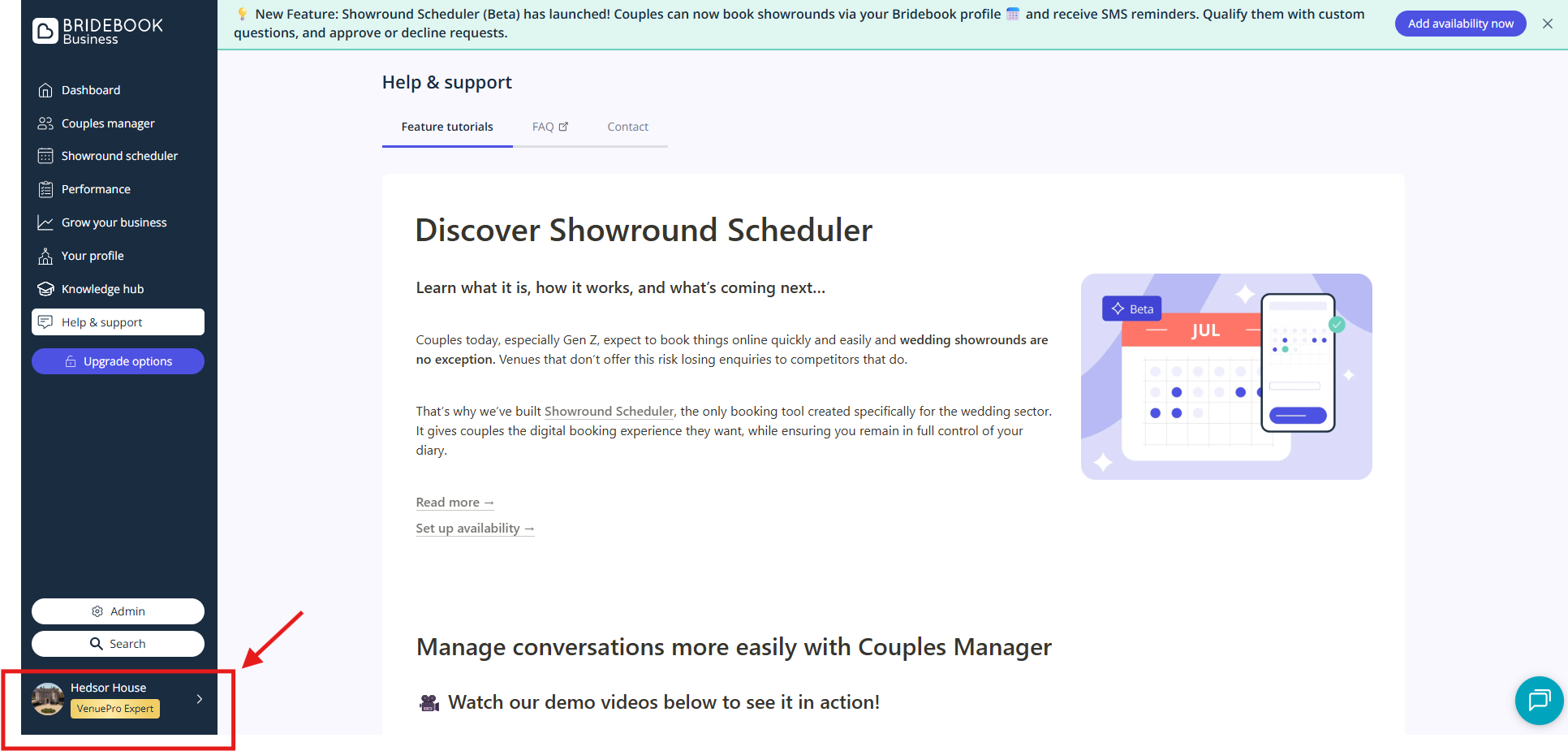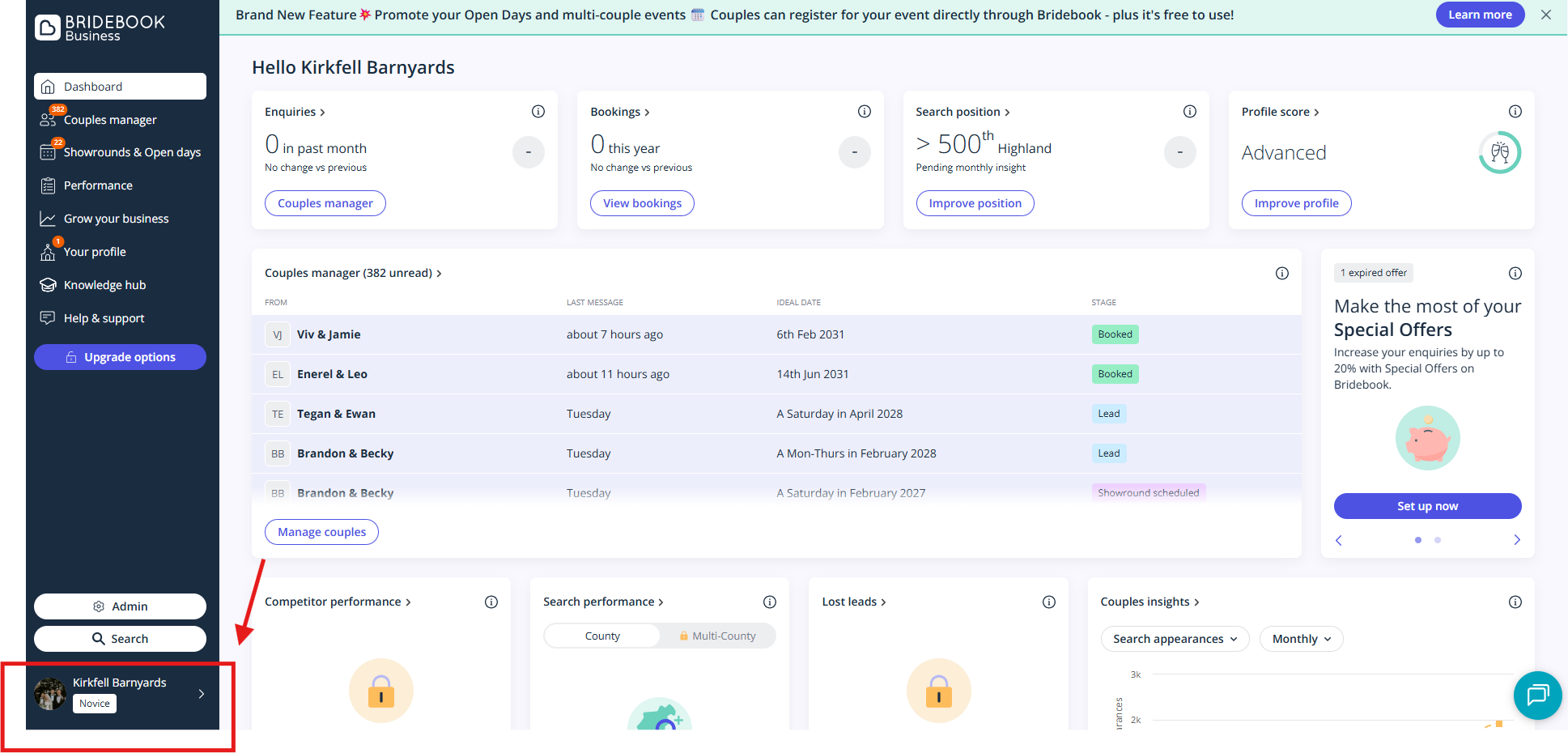 Once you've logged into your Bridebook account, your membership will be shown right below your venue name and photo in the bottom left corner. Depending on your membership, you will receive different exclusive features, tools, and perks.