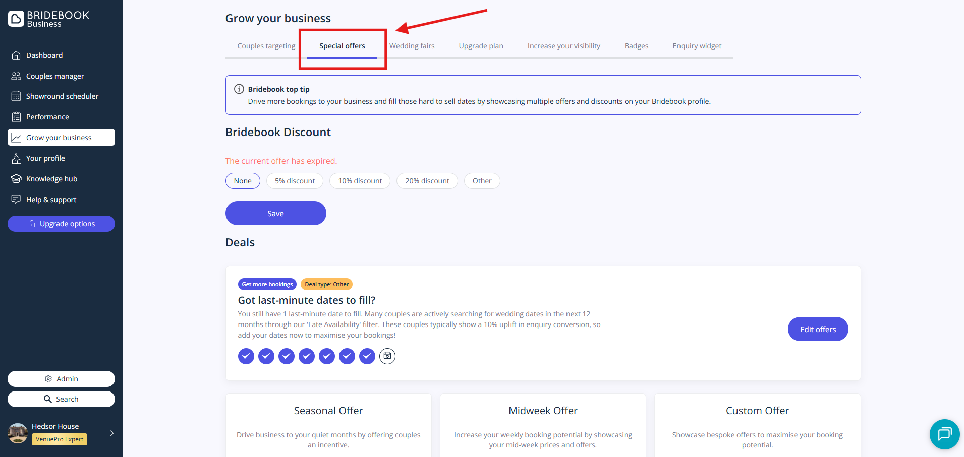 Dive into your Bridebook and discover your special offers! Log in to your account, head over to 'Grow your business' on the left (it's right above 'Your profile') and select 'Special offers'.