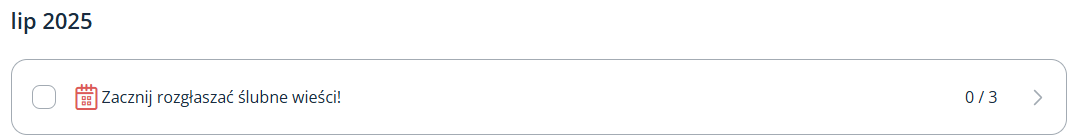 Twoje narzędzie Listy Zadań ślubnych jest automatycznie generowane na podstawie daty ślubu. Traktuj Listę Zadań jako swojego osobistego przewodnika, wspierającego Cię na każdym kroku — od momentu zaręczyn aż do wielkiego dnia. Pełna wskazówek, porad i pomocnych przypomnień, zawiera wszystko, czego potrzebujesz, aby pozostać zorganizowaną i na właściwej ścieżce podczas całej ślubnej organizacji.