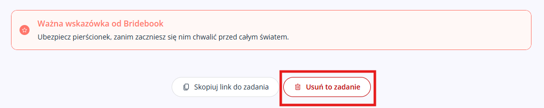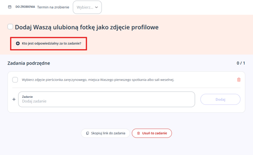 Po kliknięciu zadania znajdziesz opcję przypisania osoby odpowiedzialnej, wybierając przycisk „Kto odpowiada za to zadanie?”. Jeśli Twój partner lub ktoś inny z zespołu ślubnego ma zająć się danym zadaniem, śmiało wpisz tam jego imię!