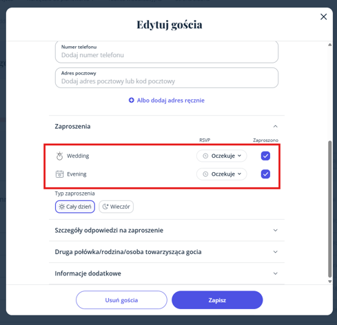 - Filtruj gości według: Zaproszenia – Cały dzień lub Zaproszenia – Tylko wieczór