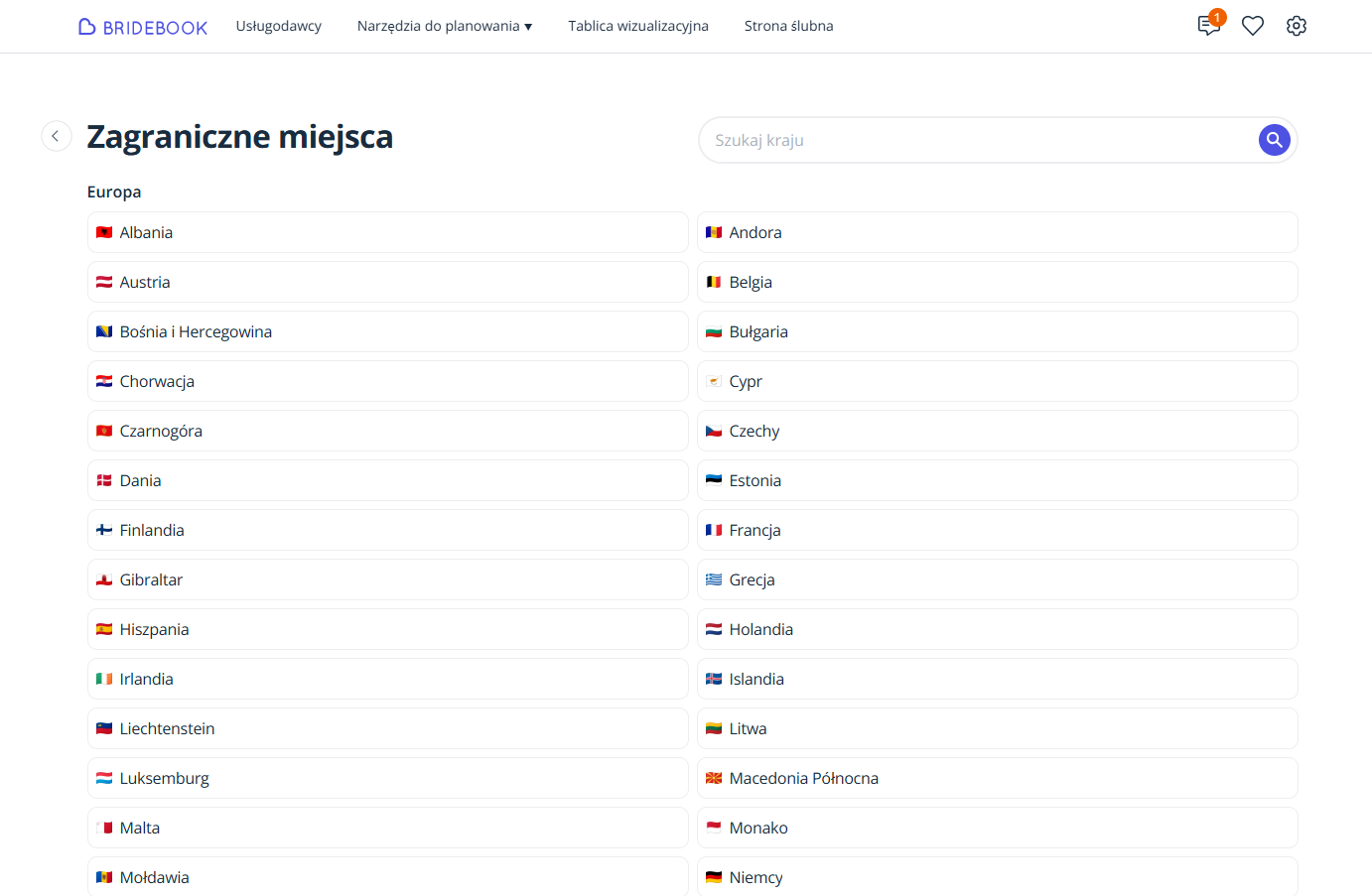 Przedstawiamy naszą globalną funkcję wyszukiwania! To ekscytujące osiągnięcie oznacza, że teraz masz możliwość przeglądania miejsc ślubnych i dostawców usług w różnych krajach, otwierając przed sobą świat możliwości na ten wyjątkowy dzień.
